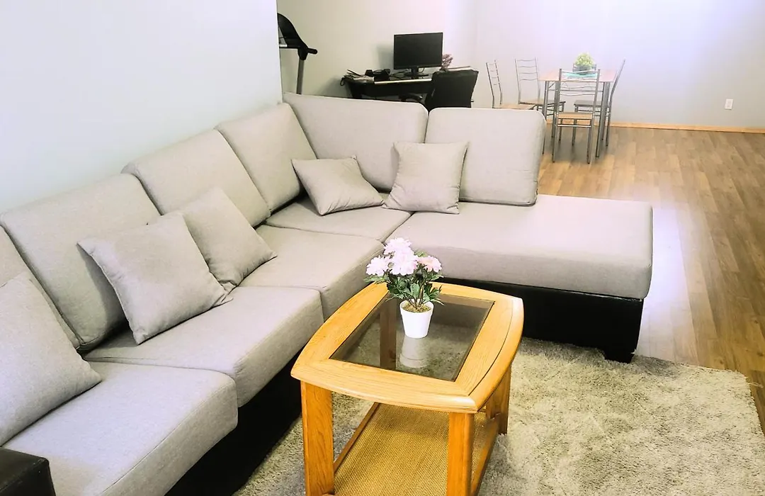 Along with such amenities as an iron and ironing board, the interior also features a multi-channel TV for guests' true comfort. Cozy 2-Bedroom Basement Suite Retreat Calgary is also furnished with a sofa set and a writing desk. Beds fitted with feather pillows are at guests' disposal. A bathroom is equipped with a separate toilet, a bath, and a shower, as well as a dryer and towels.